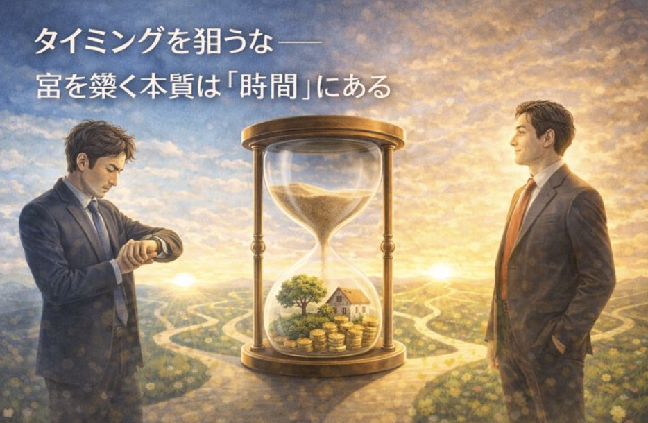 ライフハック, ライフプラン・海外移住 タイミングを狙うな──富を築く本質は「時間」にある Author イエス・オティアス Date 2025年12月21日 「ドルコスト平均法」はただの格言ではない 投資の世界では長年にわたって、こうしたフレーズが語り継がれてきました