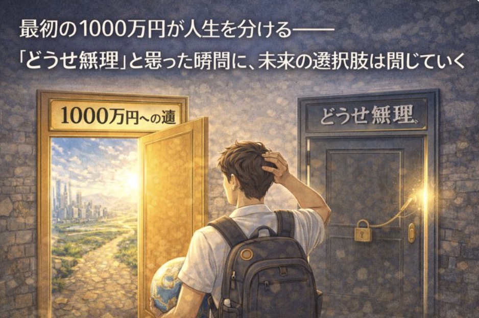 ライフプラン・海外移住 最初の1000万円が人生を分ける──「どうせ無理」と思った瞬間に、未来の選択肢は閉じていく Author イエス・オティアス Date 2026年1月8日 「1000万円貯めて投資しよう」 そう言われた瞬間、多くの人はこう思ってしまう。 「いやいや、1000万円なん