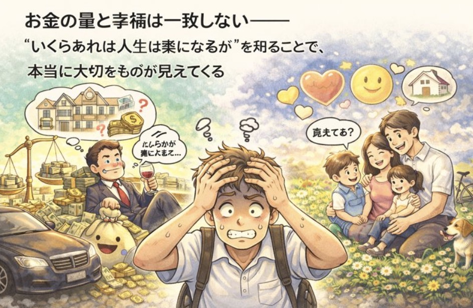 ライフプラン・海外移住 お金の量と幸福は一致しない──“いくらあれば人生は楽になるか”を知ることで、本当に大切なものが見えてくる Author イエス・オティアス Date 2026年1月9日 「お金があれば幸せになれる」 「もっと稼げば、もっと満足できるはずだ」 誰もが一度はそう考える。 そして、実際