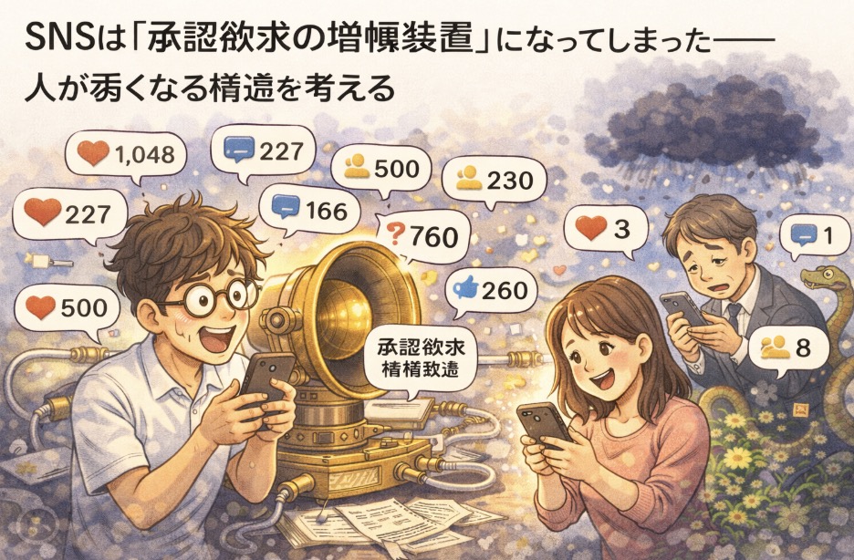 ライフプラン・海外移住 SNSは「承認欲求の増幅装置」になってしまった──人が弱くなる構造を考える Author イエス・オティアス Date 2026年1月10日 SNSというものが世に浸透して十数年。 気がつけば、ほとんどの人がスマホを開いてSNSを覗き続ける生活が当たり