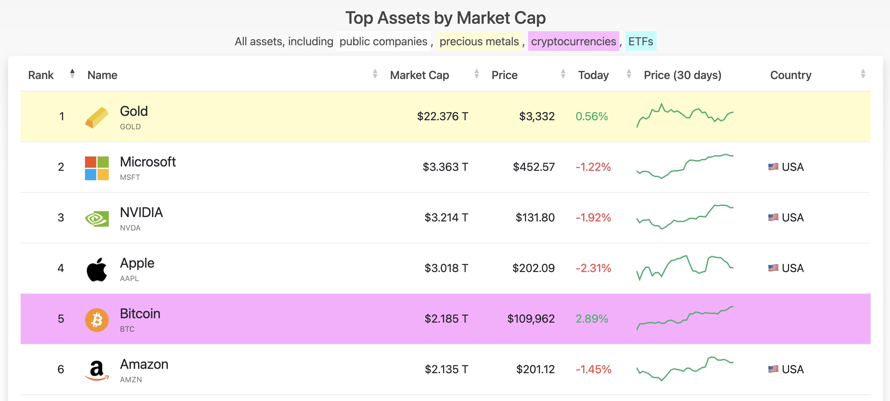 2025年5月、ビットコイン(BTC)の価格が史上初めて11万ドルを突破し、時価総額は2.18兆ドルに達しました。これにより、ビットコインはAmazonの時価総額を上回り、世界で5番目に価値のある資産となりました 。